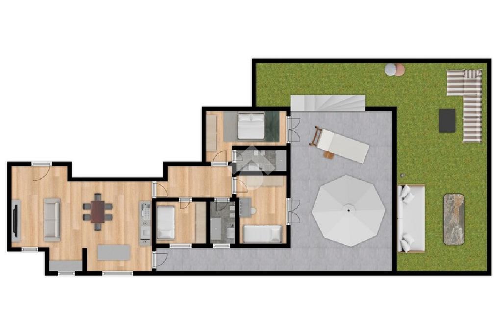 Proponiamo appartamento al piano terra con giardino così composto: soggiorno con cucina a vista, tre camere e doppi servizi. Terrazzo di 85 mq circa.