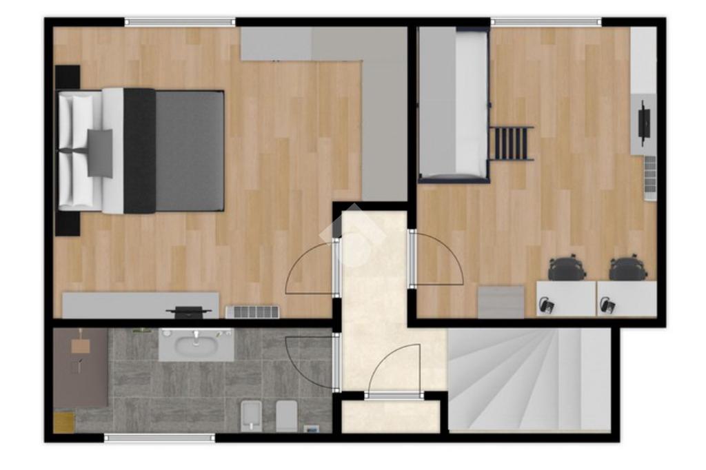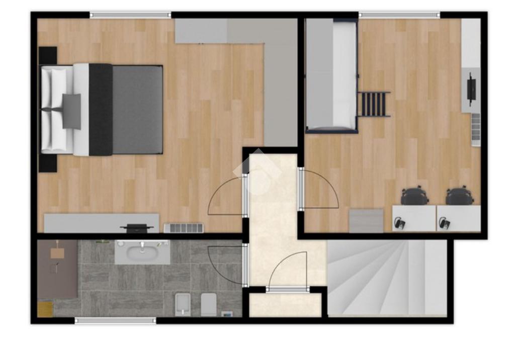 Piano terra: ingresso, soggiorno, cucina separata, ripostiglio e servizio. Scala di collegamento interna in muratura al piano primo composto da: due camere, rifinite in parquette, e servizio.