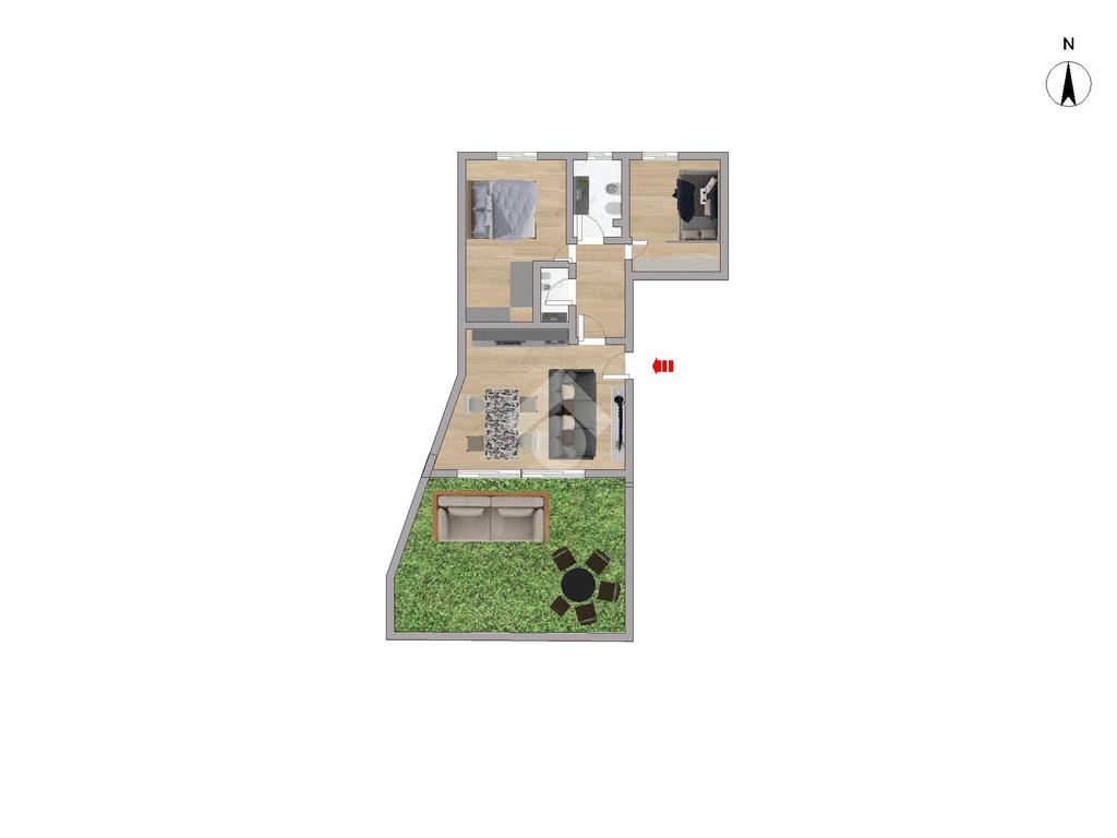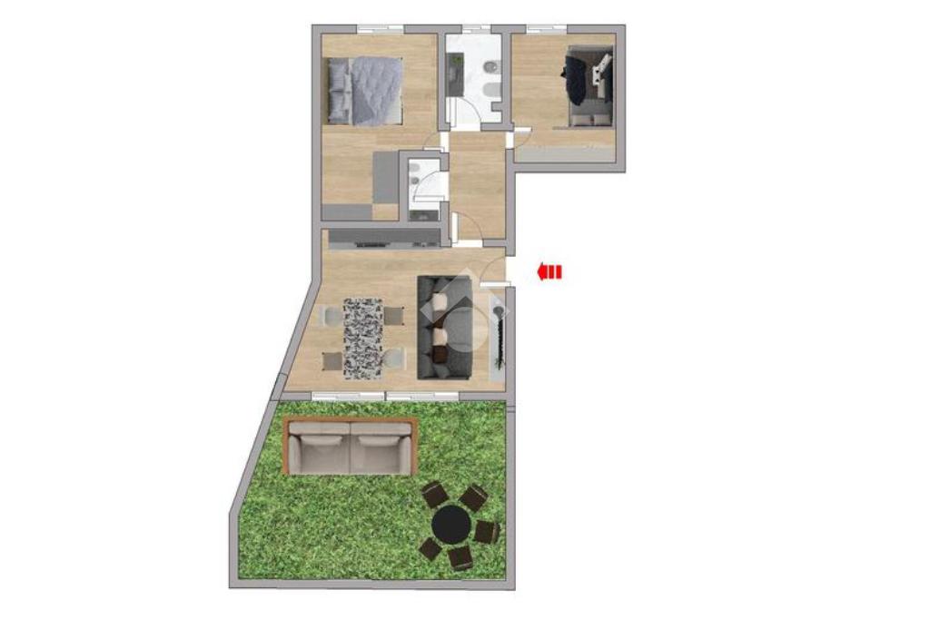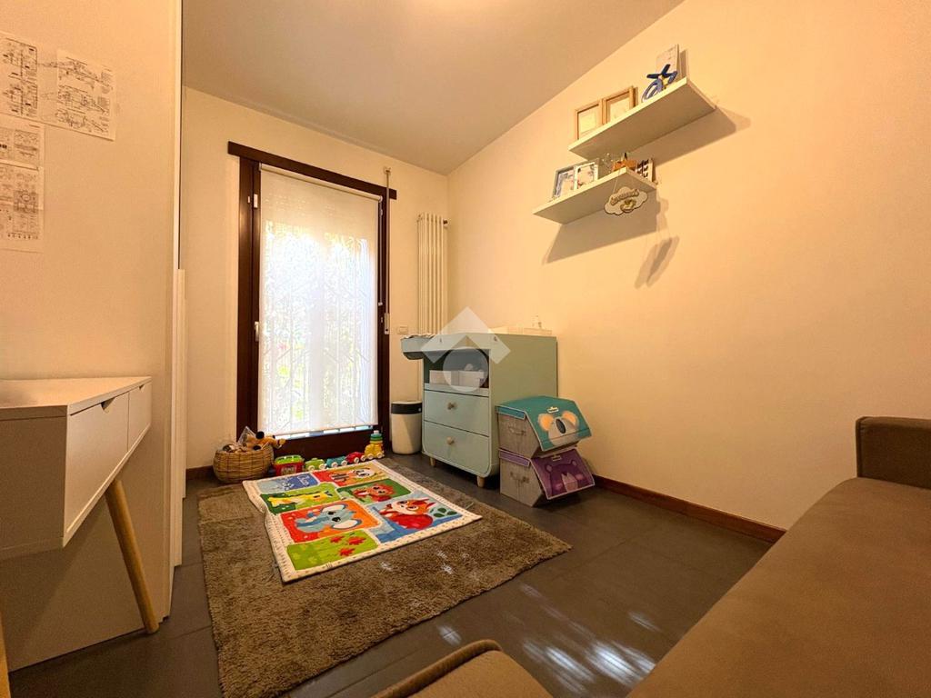 Ottimo e luminoso appartamento al piano terra con giardino e graziosa loggia coperta. Composto da: ampia zona giorno con cucina a vista, camera matrimoniale con cabina armadio, cameretta e doppi servizi.
